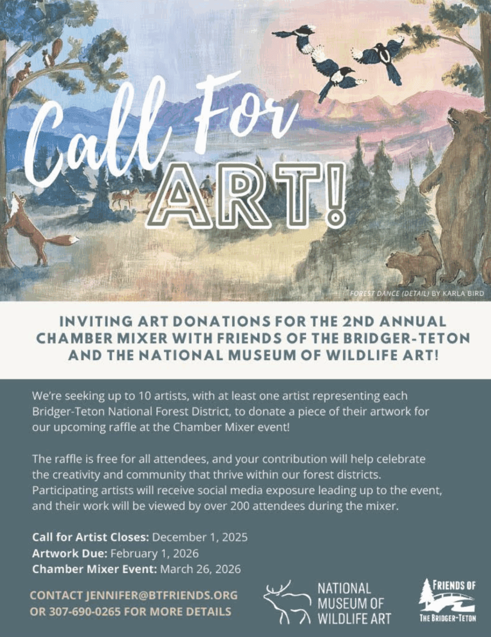 The Friends of the Bridger-Teton/National Museum of Wildlife Art JH CHamber Mixer is from 5–7 p.m. March 26, 2026. This event is free for all to attend.