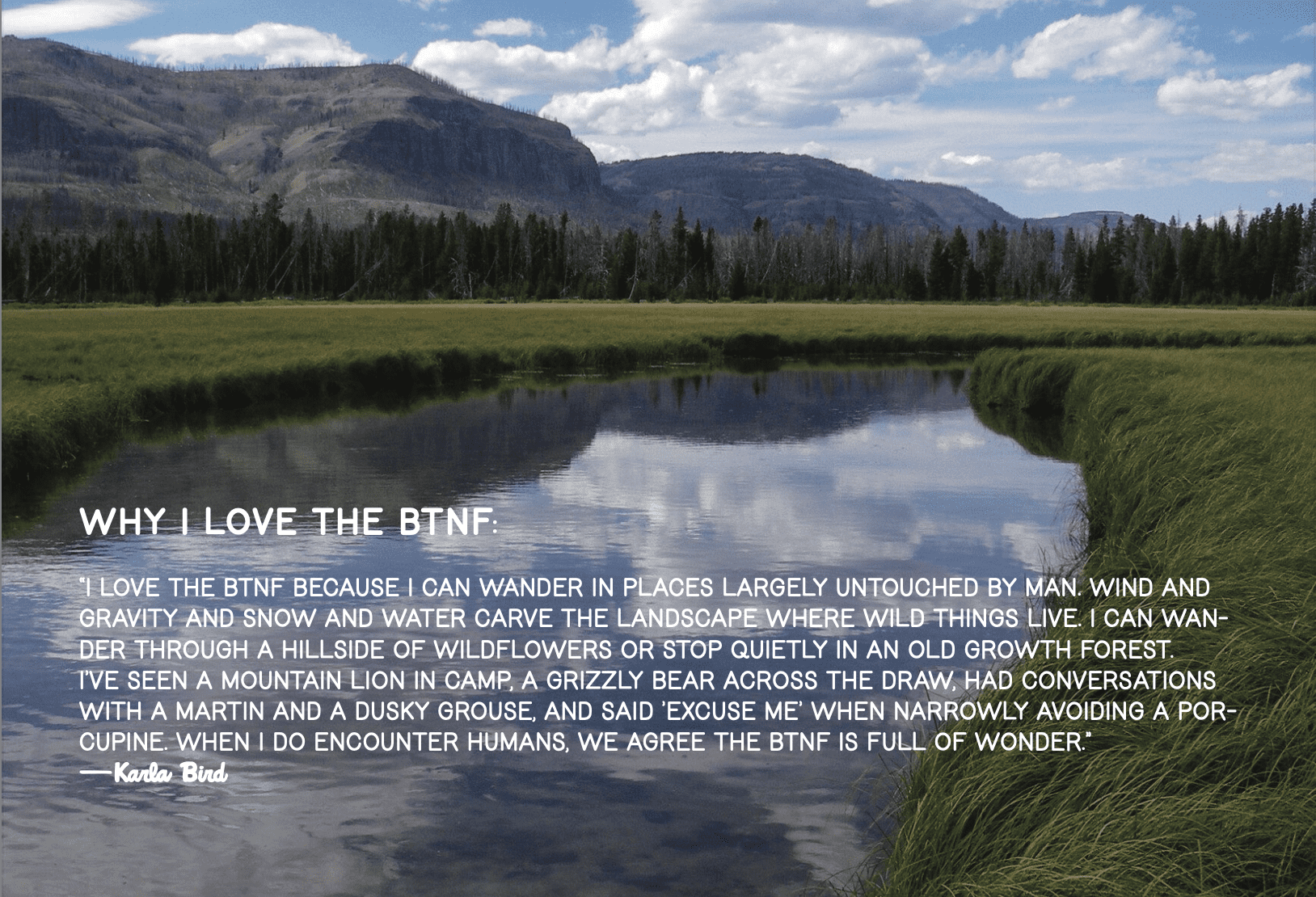 Karla had a 34-year career in federal land management—mostly with the BLM, but with some time working for the USFS on the Umpqua National Forest in Oregon. “I think this gives me an understanding of what it is like for staff on the ground,” she says. “My experience is that these are dedicated professionals who want to do the best they can but often don’t have the time or resources.” Karla sees Friends of the Bridger-Teton as an organization that can step in with additional resources, and, in dire circumstances, even staff. “I’m excited to help a place I love so much and that inspires me so much,” says Karla, who first engaged with FBT by creating original artwork for some of our events.
